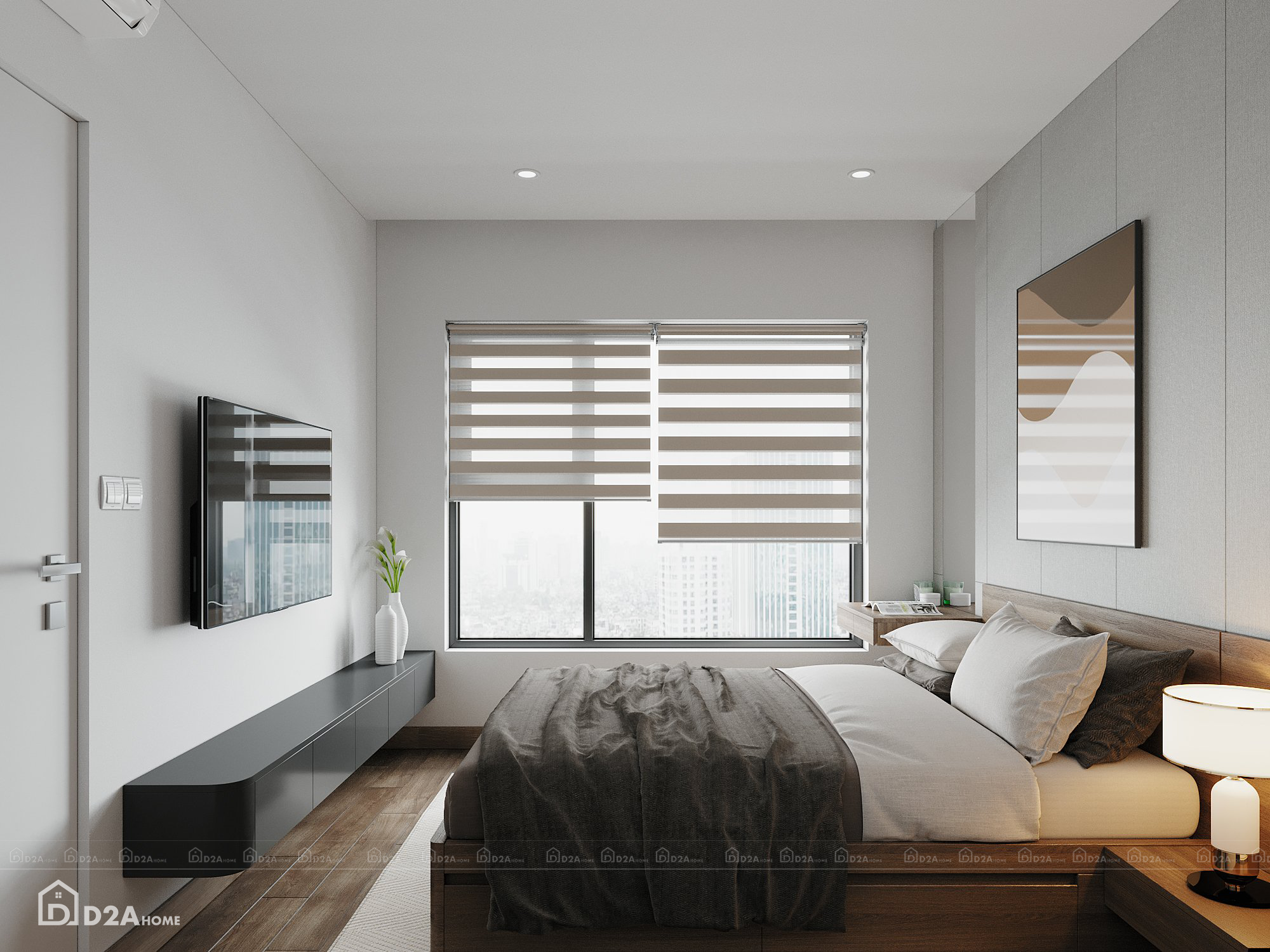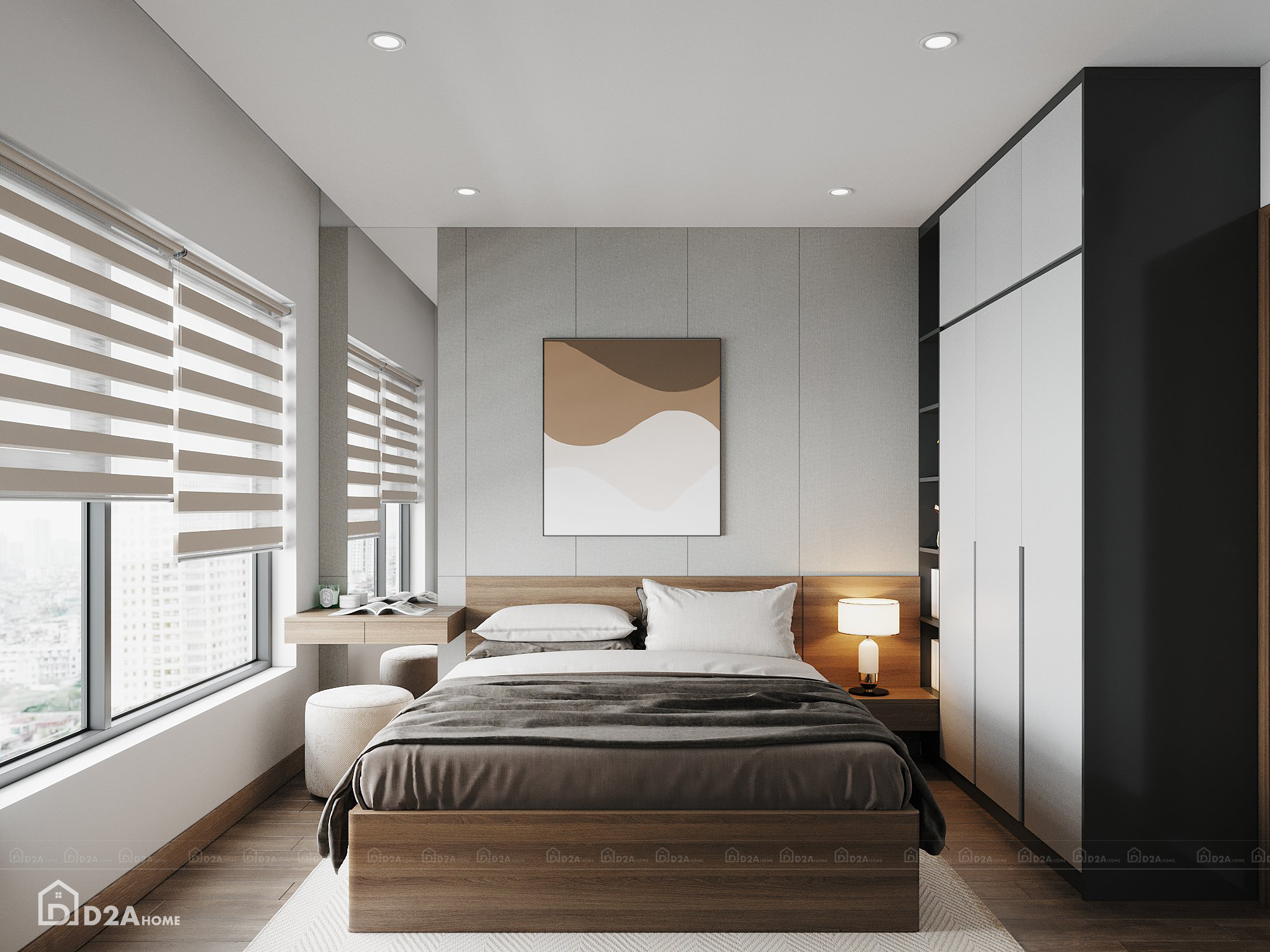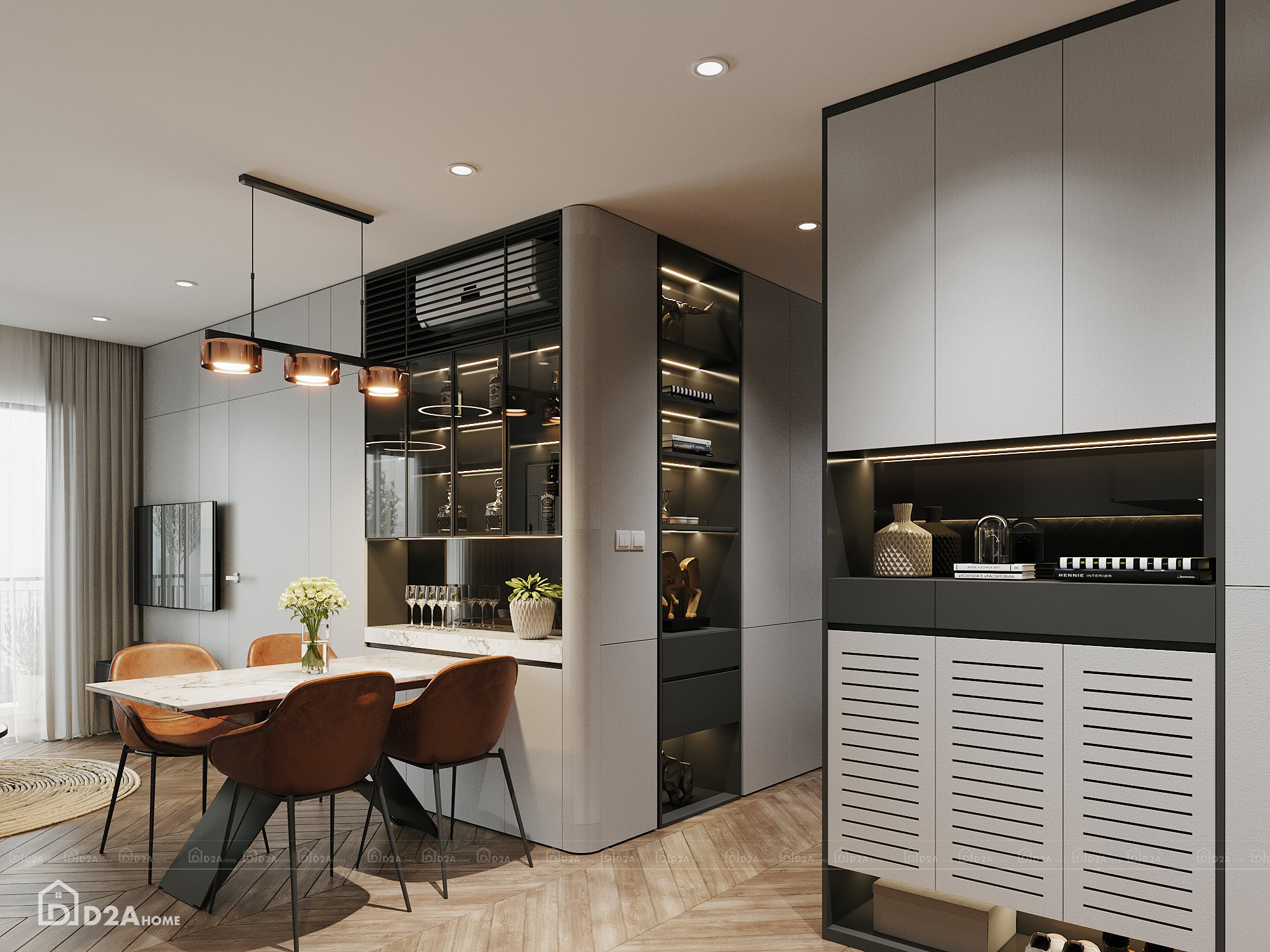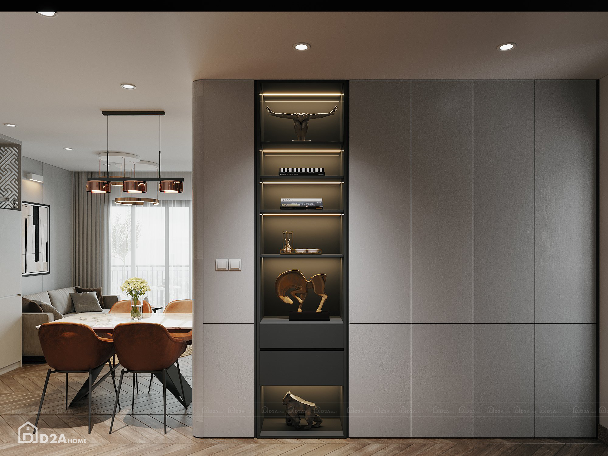 Với lối phong cách hiện đại, D2AHome đã tư vấn khách hàng sử dụng gam màu xám chủ đạo, kết hợp với một chút sắc nâu và sắc than. Việc bố trí nội thất hợp lý cùng với việc tối ưu công năng sử dụng và tận dụng ánh sáng tự nhiên giúp căn hộ có chiều sâu, xóa tan hạn chế về diện tích của chung cư eo hẹp.