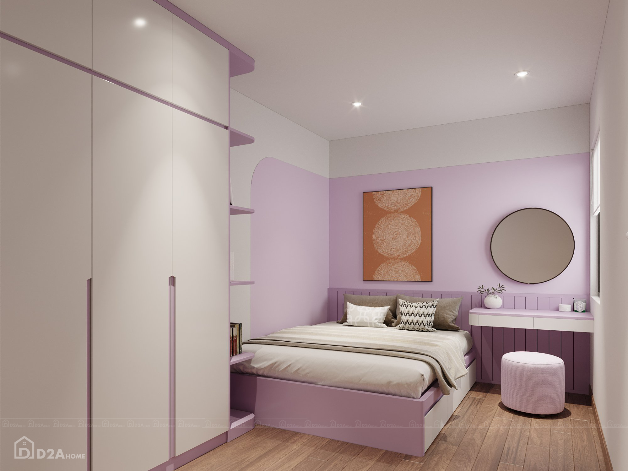Kiến trúc sư D2AHome đã sử dụng gam màu tím tạo nên không gian hiện đại, vừa tôn vinh sự thủy chung sắt son trong tình cảm vợ chồng. Không những thế, không gian phòng ngủ còn được bố trí thêm tủ sách và bàn trang điểm, tạo nên điểm nhấn và phản ánh được gu thẩm mỹ cho gia chủ.